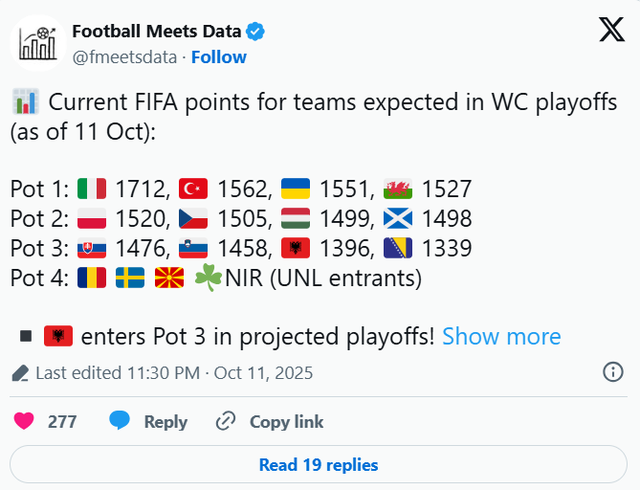 Me rezultatet dhe renditjen e deritanishme, skenari është që Shqipëria në play-off e Kupës së Botës 2026 të ndeshej me njërën prej Skocisë, Polonisë, Çekisë apo Hungarisë. Kombëtarja jonë ndodhet në vazon e tretë.