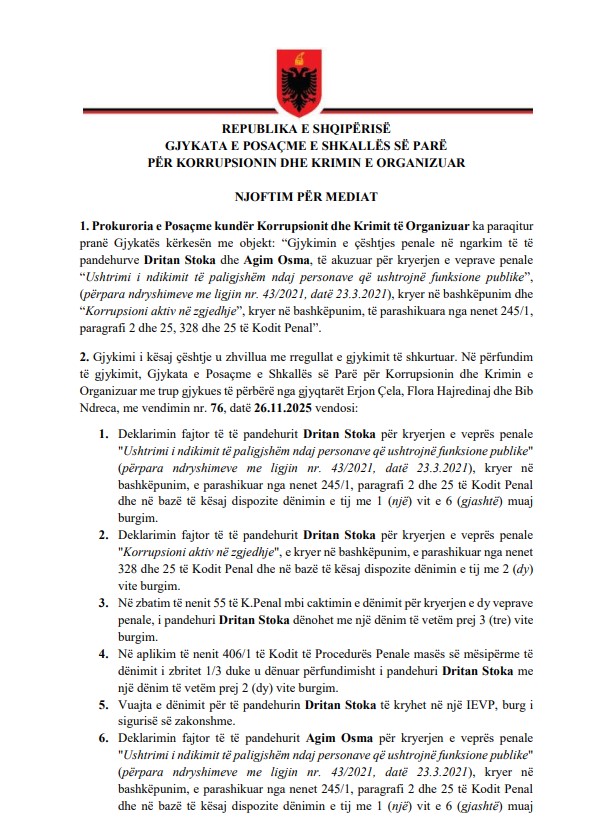 Dritan Stoka, ish-zyrtar në Drejtorinë e Përgjithshme të Kadastrës, është dënuar me 2 vite burg nga Gjykata e Posaçme për veprat penale “Ushtrimi i ndikimit të paligjshëm ndaj personave që ushtrojnë funksione publike” dhe "Korrupsioni aktiv në zgjedhje", pasi në zgjedhjet vendore të vitit 2019 premtonte leje legalizimi në zonën e Saukut në Tiranë, si edhe punësime në këmbim të votës për Partinë Socialiste.