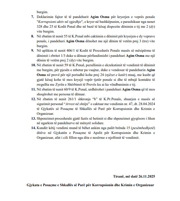 Për të njëjtin krim zgjedhor GJKKO ka dënuar me 2 vite burg Agim Osmën, kryeplak i Lagjes së Re në Sauk, por togat e zeza vendosën pezullimin e ekzekutimit të vendimit të dënimit me burgim, për pjesën e mbetur pa vuajtur, duke e vendosur të pandehurin në provë për një periudhë kohe prej 24 (njëzet e katër) muaj, me kusht që gjatë kësaj kohe të mos kryejë vepër tjetër penale si dhe të mbajë kontakte të rregullta me Zyrën e Shërbimit të Provës ku ai ka vëndbanimin e tij.