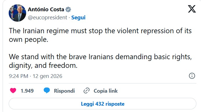 Në një postim në rrjetin social X, Costa shkruan se regjimi iranian “duhet të ndalojë represionin e dhunshëm ndaj popullit të tij”. Ai thekson se Bashkimi Europian qëndron në krah të qytetarëve iranianë që kërkojnë të drejta themelore, dinjitet dhe liri.