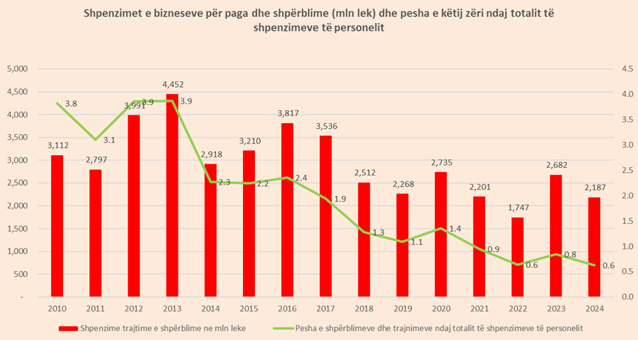 Shpërblimet dhe trajnimet zunë vetëm 0.6 % të shpenzimeve të personelit me 2024 nga 0.8 që ishin në vitin 2023. Pesha e shpërblimeve dhe trajnimeve nga 3.9 % të shpenzimeve të personelit më 2013 pësuan rënie sistematike më pas për të rënë poshtë 1 % pas pandemisë.
