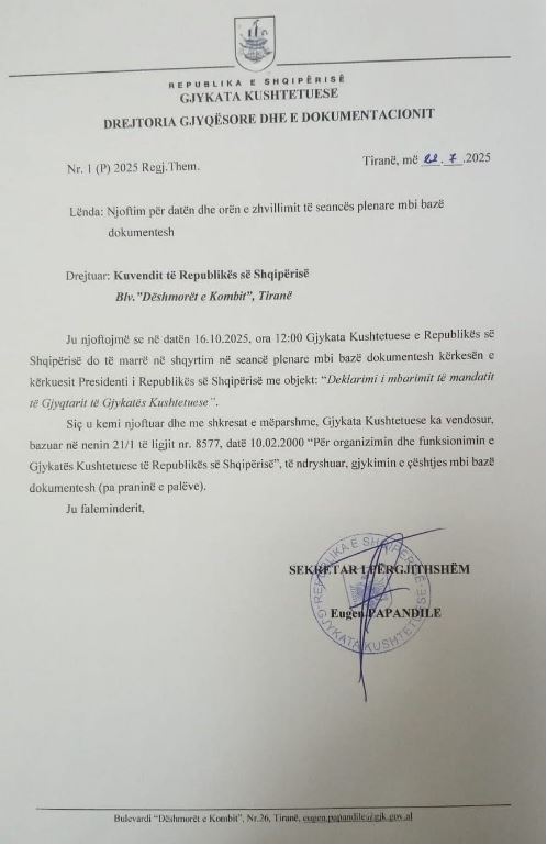 Seanca do të zhvillohet bazuar në një kërkesë të Presidentit të Republikës, i cili ka kërkuar interpretimin e kohëzgjatjes së mandateve të gjyqtarëve kushtetues.
