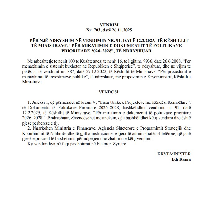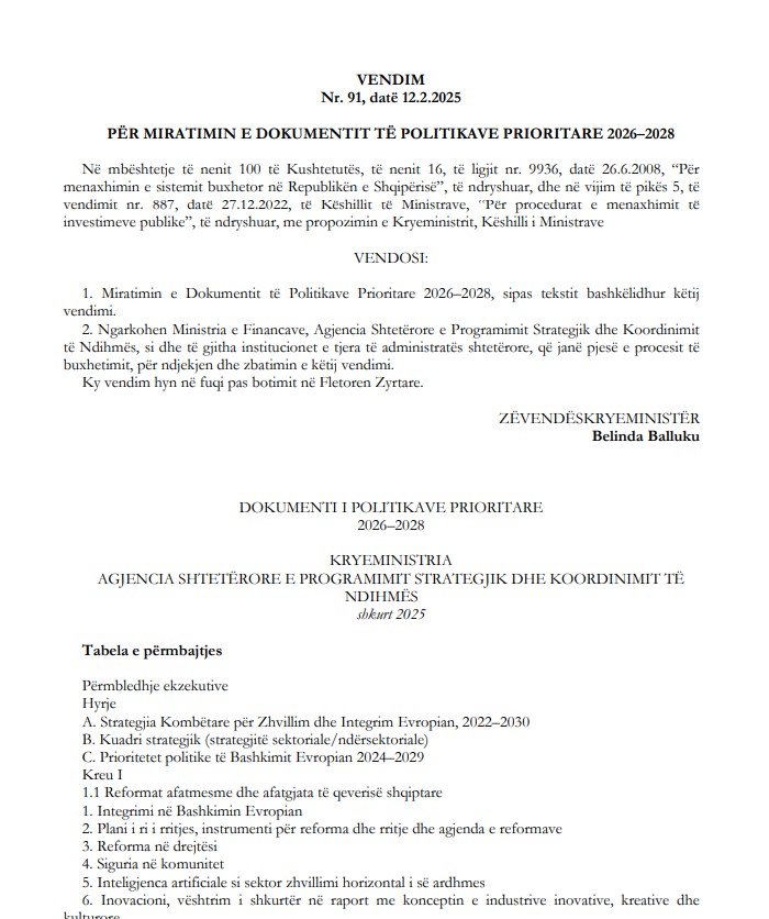 Qeveria ka ndryshuar listën me projektet prioritare për periudhën 3-vjeçare 2026-2028. Ky dokument i qeverisë i miratuar në fillim të këtij viti me 134 projekte madhore, ka ndryshuar dhe ka të listura 120 investime në të gjitha fushat e ekonomisë, nga të cilat 48 projekte janë maturuar dhe ka nisur zbatimi, 36 projekte janë në proces dhe 36 të tjera janë projekte të pamaturuara, pra janë ende një ide por e pazhvilluar më tej.