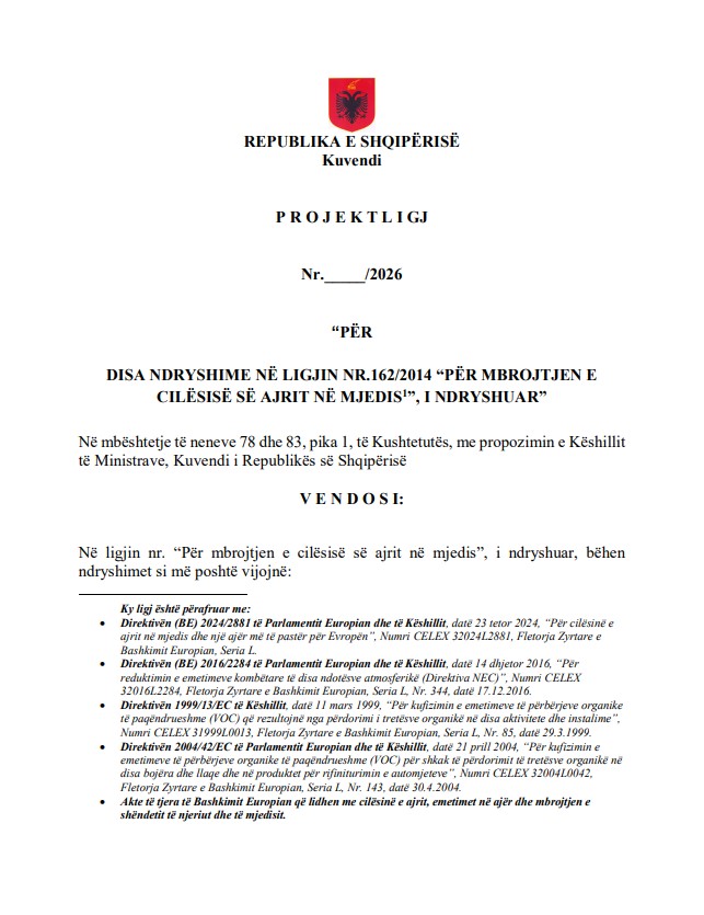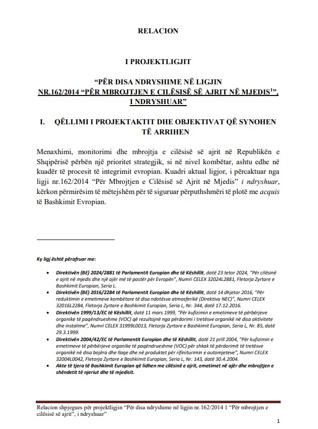 “Megjithatë, kuadri aktual ligjor, i përcaktuar nga ligji nr.162/2014 “Për Mbrojtjen e Cilësisë së Ajrit në Mjedis” i ndryshuar, paraqet boshllëqe dhe mangësi në lidhje me monitorimin e cilësisë së ajrit, përcaktimin e metodologjive dhe zbatimin masave në rastet e tejkalimit të niveleve të përcaktuara të ndotësve”, thuhet në relacion.