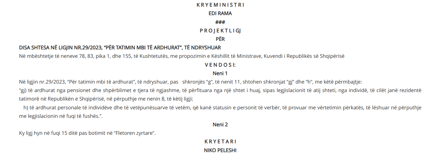Qeveria shqiptare i rikthen edhe një herë sytë nga diaspora, por jo vetëm, fokusi do të jetë edhe tek pensionistët e huaj. Përmes një projektligji të miratuar në qeveri ndryshohet ligji “Për tatimin mbi të ardhurat”, i cili përjashton nga tatimi pensionet që përfitohen nga jashtë vendit, për individët që janë ose bëhen rezidentë tatimorë në Shqipëri.