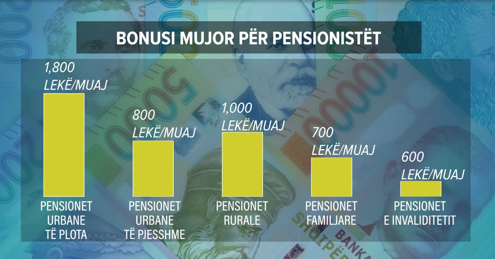 Për të mbështetur më shumë pensionistët përballë këtyre pagesave të ulta, qeveria ka prezantuar një skemë me bonuse mujore, që do të nisin nga janari 2026. Për qeverinë këto bonuse i rikthejnë dinjitetin pensionistëve, pasi jepen 1,800 lekë në muaj për pensionet urbane me vite të plota pune, 800 lekë/muaj për pensionet urbane të pjesshme apo 1000 lekë në muaj për pensionet rurale.