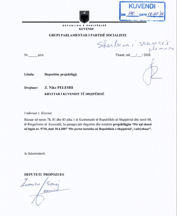 Një propozim që mban firmën e deputetes së Partisë Socialiste, Zamira Sinaj, synon të krijojë një korsi të shpejtë dhe paralele për realizimin e porteve turistike, duke bërë një ndërhyrje në legjislacionin ekzistues.