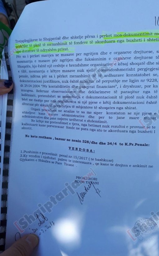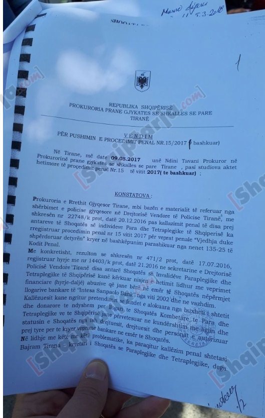 Nga ana e saj prokuroria ka konstatuar se dokumentacioni i cili sipas kallëzuesve do të faktonte dëmin ekonomik është dëmtuar gjatë përmbytjeve të ambjenteve të shoqatës së tetraplegjikëve.