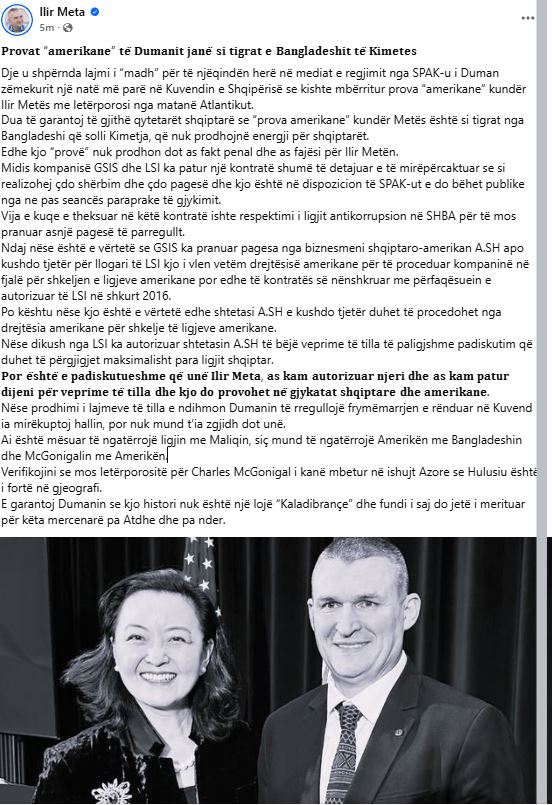 Dua të garantoj të gjithë qytetarët shqiptarë se “prova amerikane” kundër Metës është si tigrat nga Bangladeshi që solli Kimetja, që nuk prodhojnë energji për shqiptarët.