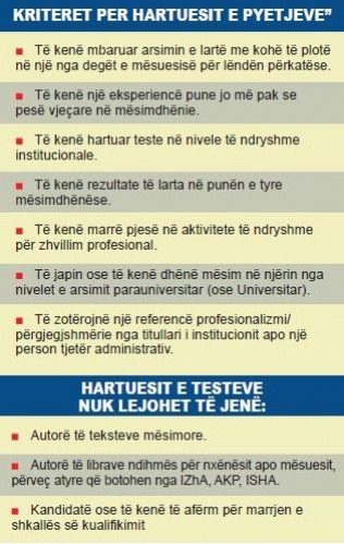 (Në foto kriteret që duhet të plotësojnë hartuesit e provimeve të mësuesve)