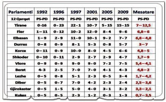 (Në foto rezultatet e zgjedhjeve PD dhe PS në 12 qarqe nga 1992 deri më 2009)