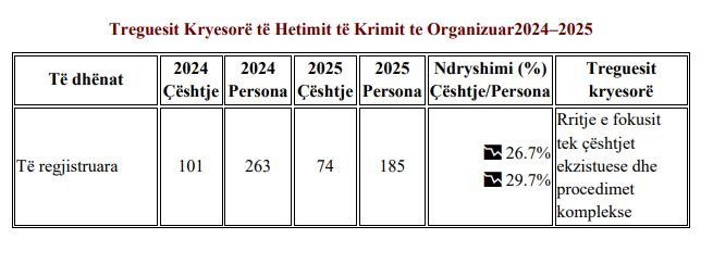 Të dhënat për vitin 2025, krahasuar me vitin e mëparshëm, tregojnë një orientim më strategjik të hetimeve të SPAK në luftën kundër krimit të organizuar. Megjithëse, fluksi i çështjeve të reja dhe i personave të regjistruar ka pësuar një ulje, rritja e personave në hetim dhe e atyre të dërguar në gjykatë tregon një fokus më të madh tek procedimet më komplekse dhe me pasoja më të rënda për shoqërinë.