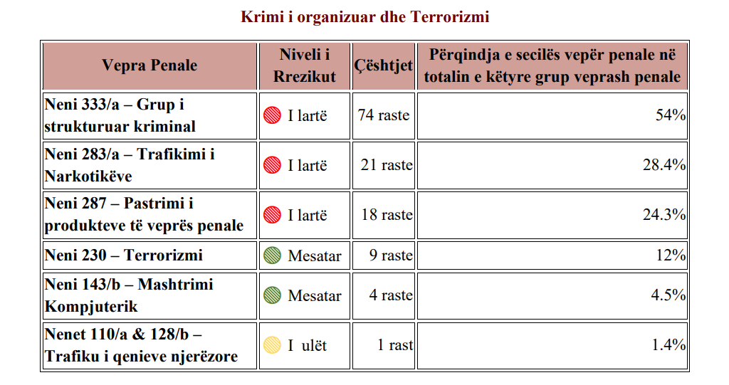 Në raportin vjetor ku pasqyrohet puna e strukturës përgjatë vitit 2025, SPAK tregon me shifra riskun për kryerjen e veprave penale nga grupe të strukturuara si dhe për shifrat e terrorizmit. Ndër veprat penale kryesore, nga hetimi i vitit 2025 vihet re se, shumica e tyre kanë tendencë të kryhen në kuadër të grupit të strukturuar kriminal (54%) dhe kjo formë e kryerjes së këtyre veprave penale vijon të mbetet shqetësuese dhe me risk të lartë. Riskun më të madh ndër veprat penale e paraqet trafikimi i narkotikëve (28.4%), pasuar nga pastrimi i produkteve të veprës penale (24.3%). Veprat penale të lidhura me terrorizmin (12%), paçka nivelit të rënies së tyre, konsiderohen me risk mesatar për shkak të ndikimit të tyre në sigurinë kombëtare dhe publike, ndërsa mashtrimi kompjuterik (4.5%) dhe trafiku i qenieve njerëzore (1.4%) kanë risk më të ulët, por kërkojnë monitorim për pasojat sociale dhe karakterin ndërkufitar të tyre. Në tërësi, trafiku i narkotikëve dhe pastrimi i parave në kuadër të krimit të organizuar mbeten vepra penale më me prioritet për SPAK.