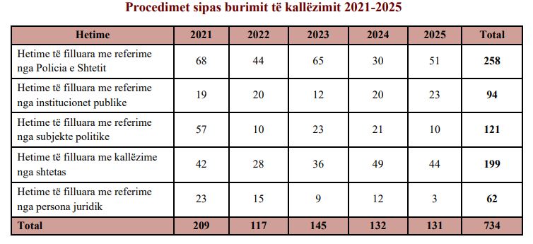 Gjatë vitit 2025, konstatohen në total 131 hetime të filluara me kallëzime dhe referime nga individë dhe institucione, duke ruajtur një trend të ngjashëm me vitin paraardhës (132 hetime). Në ndryshim nga viti 2024, të dhënat statistikore tregojnë se hetimet e filluara me referime nga Policia e Shtetit, për vitin 2025 kanë shënuar një rritje me rreth 70%, nga 30 në 2024 në 51 në 2025.