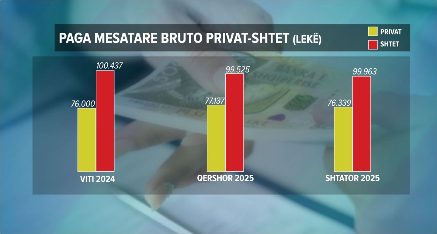E gjithë kjo ulje e pagës ka ardhur prej sektorit privat. Pas reformës së pagave për administratën publike, në vitet 2023 -2024, hendeku mes pagës mesatare në shtet dhe asaj në privat, është thelluar. Paga mesatare në shtet nga 74 mijë lekë në 2022-shin, ka arritur në 100 mijë lekë. Ndërsa në privat në shtator paga mesatare ishte 76.3 mijë lekë nga 77 mijë lekë në qershor të 2025-ës.