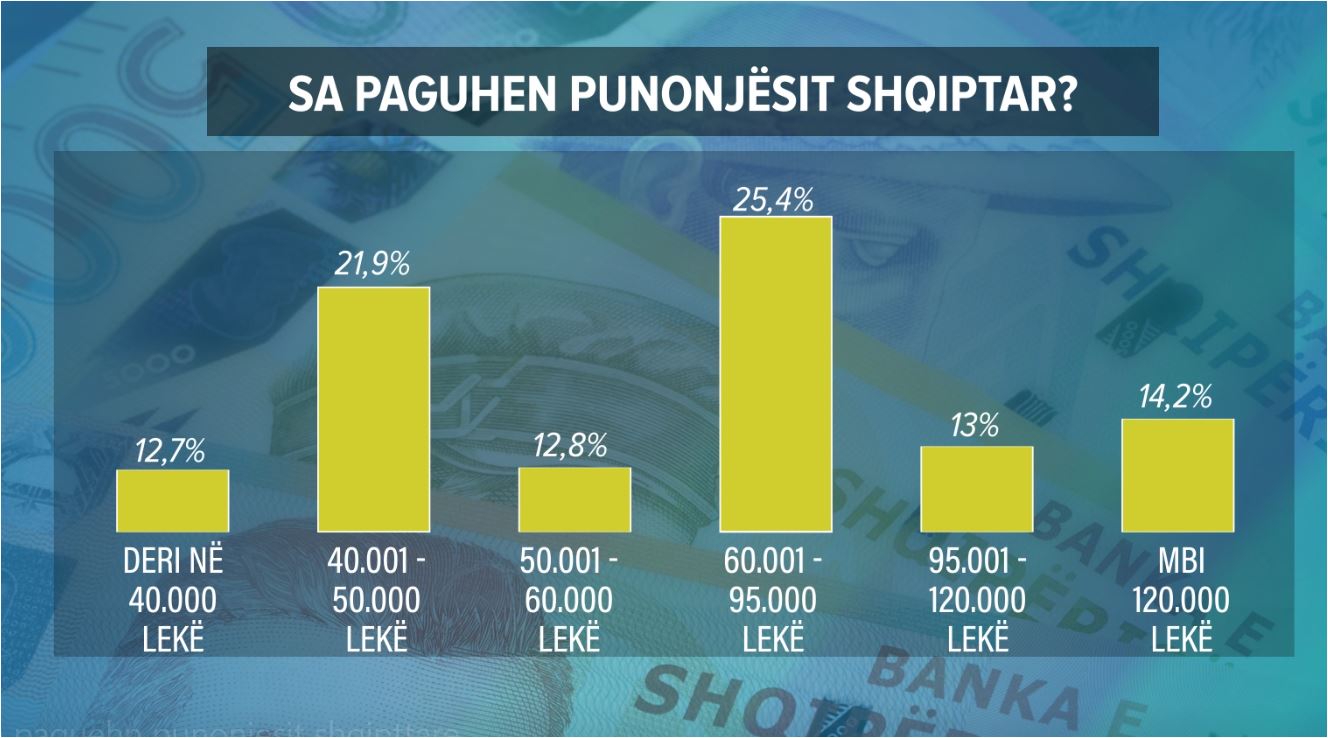 Pavarësisht aksioneve kundër nëndeklarimit të pagave nga bizneset, apo caktimit të referencave për rrogat në sektorin e turizmit apo edhe rritjes së tyre të detyruar të pagave për shkak të mungesës së punonjësve, shifrat e INSTAT, tregojnë se pjesa më e madhe e punonjësve nuk e arrijnë pagën mesatare as të përgjithshme dhe as mesataren e sektorit privat. 48% e të punësuarve', thotë INSTAT paguhen deri në 60 mijë lekë.