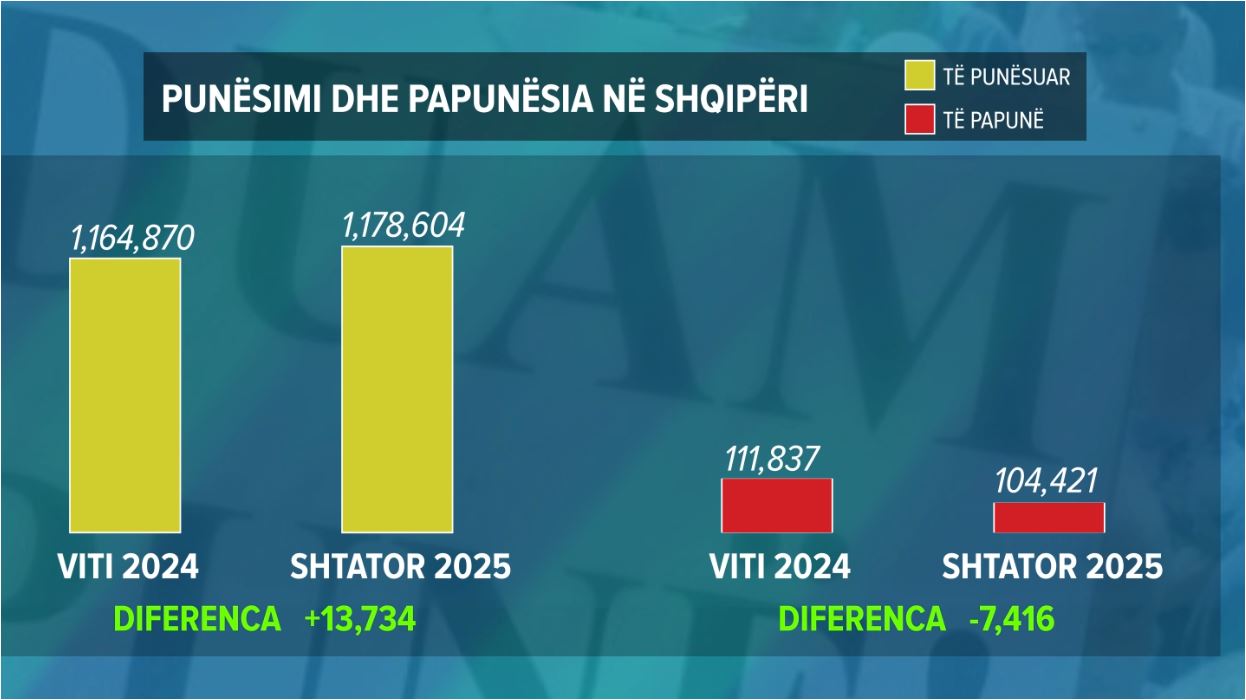 Në Shqipëri rezultojnë rreth 1.1 milionë të punësuar por nga këto vetëm 771 mijë janë me sigurime shoqërore dhe shëndetësore. Ndërkohë kemi 104 mijë shqiptar të papunë, nga të cilët më shumë se 67 mijë qytetarë janë regjistruar pranë zyrave të punës si punëkërkues. Por si paradoks, teksa mijëra qytetarë kërkojnë punë, bizneset ankohen për mungesë stafi e kanë shpallur 6 mijë vende të lira pune.