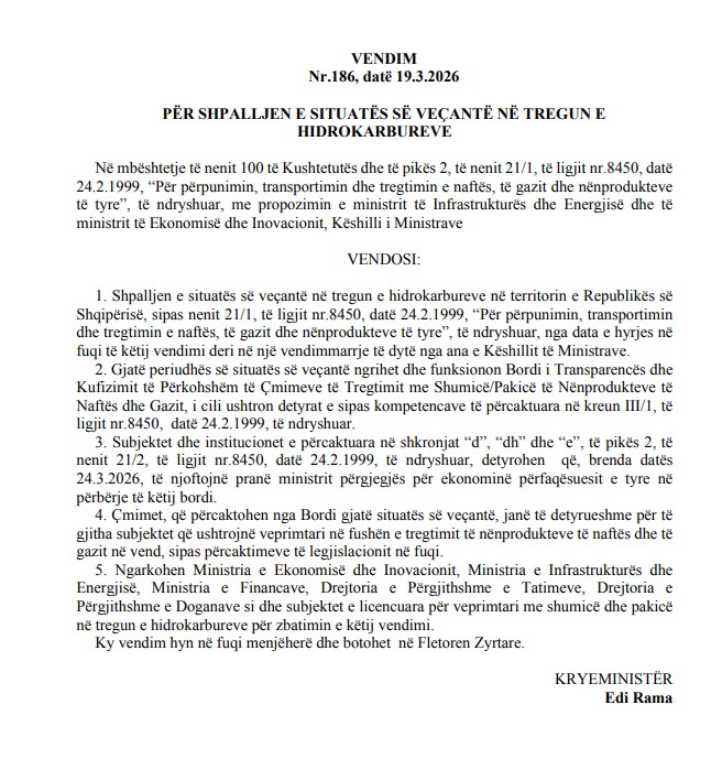 TIRANË- Ka hyrë zyrtarisht në fuqi vendimi i qeverisë për shpalljen e situatës së veçantë në tregun e hidrokarbureve pas shtrenjtimit të çmimeve, pas luftës në Lindjen e Mesme. Vendimi është marrë me firmë të kryeministrit Edi Rama dhe kompanitë kanë afat deri më datë 24 mars që të dorëzojnë pranë ministrit përgjegjës për Ekonominë përfaqësuesit e tyre në përbërje të këtij bordi. Burime për Report Tv sqarojnë se Bordi pritet të mblidhet brenda kësaj jave për caktuar çmimet tavan për tregtimin e naftës.