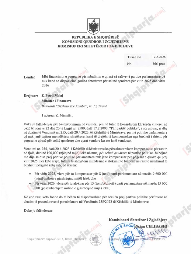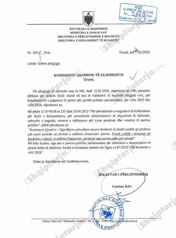Përmes një shkrese të siguruar nga Report TV, më datë 12 shkurt 2024, KQZ i është drejtuar zyrtarisht dikasterit të Financave ku kërkohet fond për partitë për vitet 2025 dhe 2026.