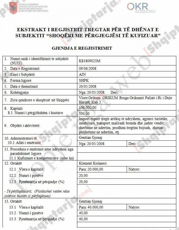 (Në foto: Kompania e ndërtimit AIN sh.p.k e regjistruar në emër të të arrestuarit Gentian Gjonaj dhe partner Klemend Kolaneci)
