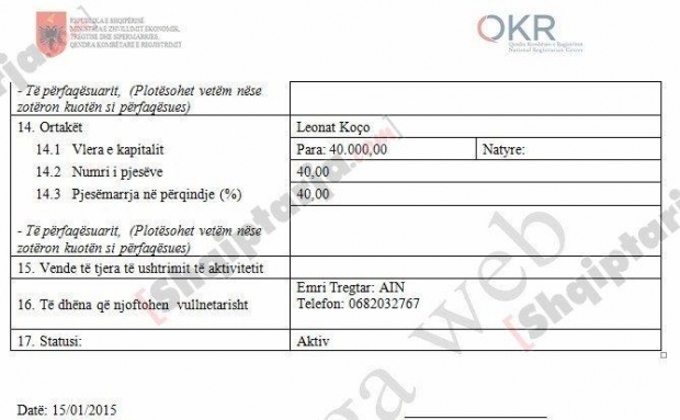 Ky i fundit, kishte krijuar kompaninë së bashku me dy aksionerët e tjerë, në vitin 2008, pra 7 vjet më parë. Sipas ekstraktit të QKR, rezulton siç e shikoni dhe nga dokumentacioni , dhe emri i të arrestuarit të një dite më parë si aksioner i përbashkët me dhëndrin e Hoxhës, çka do të thotë se lidhjet jo pa qëllim kishin përfshirë në rrjetin e kokainës Ermal Hoxhën , nipin e ish-diktatorit .