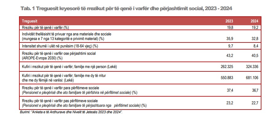 “Në vitin 2024, treguesi i rrezikut për të qenë i varfër në Shqipëri, është 19,2 %, duke pësuar një rënie prej 0,6 pikë përqindje, krahasuar me të dhënat e rivlerësuara për vitin 2023”, thotë INSTAT.