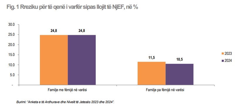 Në vitin 2024, përqindja e individëve në rrezik për të qenë të varfër, në familjet pa fëmijë në varësi, vlerësohet të jetë më e ulët, krahasuar me familjet me fëmijë në varësi.