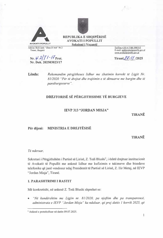 Raporti më i fundit i Avokatit të Popullit konfirmon zyrtarisht atë që Partia e Lirisë e ka denoncuar prej më shumë se një viti per shkeljen flagrante të Konventës Europiane të të Drejtave të Njeriut, të Kushtetutës dhe të ligjeve në fuqi, sa i përket mënyrës çnjerëzore të trajtimit të z. Meta në IEPV-në "Jordan Misja", ku ai ndodhet i burgosur politik pa fakte dhe pa prova penale, prej më shumë se një viti.