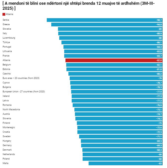 Besimi i konsumatorëve shqiptare për blerje banesë në 12 muajt në vijim ndodhet në një pozicion të ngjashëm me Belgjikën (-82.1) dhe Bullgarinë (-78.3), por më mirë se Italia (-88.9) dhe Serbia (-98.7), ku pesimizmi është edhe më i thellë.