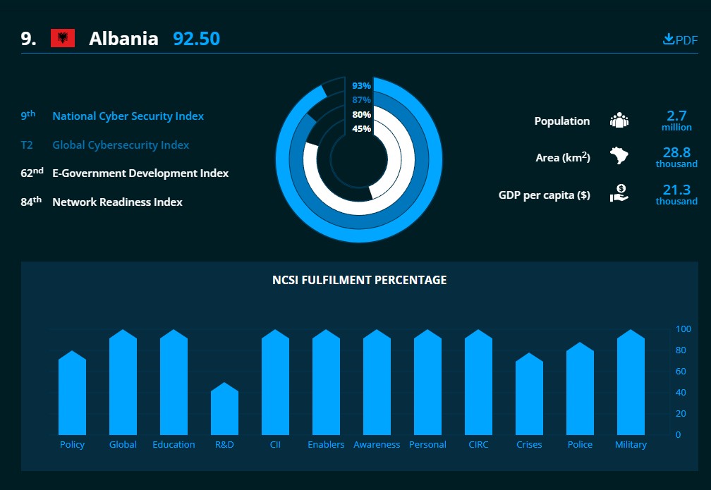Shqipëria ka bërë progres në sigurinë kibernetike duke u renditur në vendin e 9-të në botë nga Indeksi i Sigurisë Kombëtare (NCSI), me një rezultat prej 92.5 pikësh.