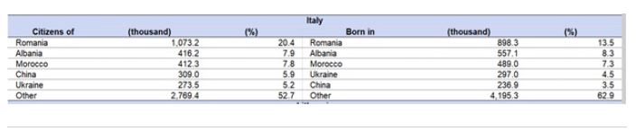 Italia është shteti i vetëm që sipas Eurostat rezulton që ka shtetas shqiptarë në tabelën e Eurostat ku jepen 5 shtetet kryesore sipas shtetësisë dhe vendit të lindjes së popullsisë së huaj / të lindur jashtë vendit. Ndërkohë mungojnë të dhënat për Greqinë, ku gjithashtu ka një komunitet të lartë të shqiptarëve. Nuk ka të dhëna as për Gjermaninë, Francën e Spanjën.