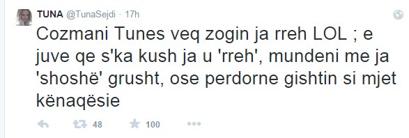 Tuna ka ironizuar përmes një postimi në “twitter” duke thënë se Cozman i rreh vetëm zogun Tunës, ndërsa ka dhënë një mesazh edhe për ata që skanë njeri që t’i