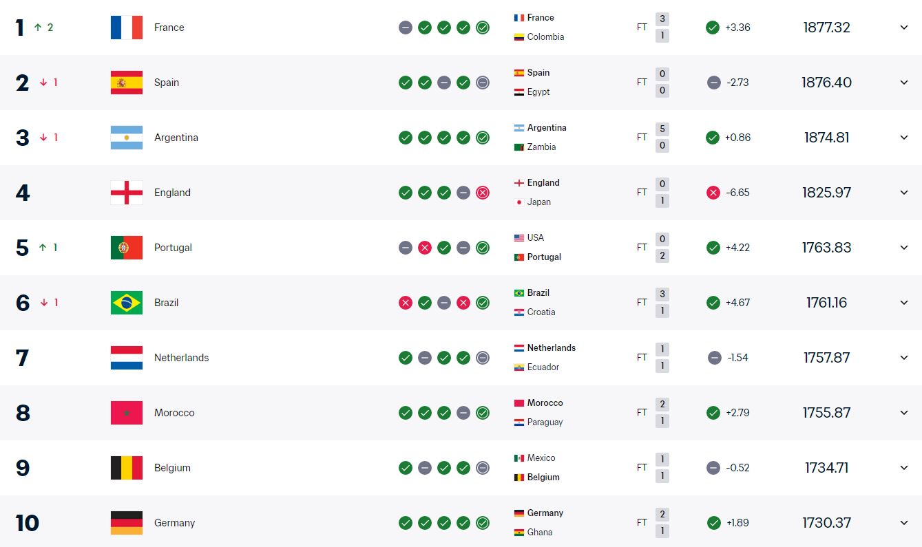 Ndërkohë, në majën e renditjes ka ndryshime të rëndësishme. Franca ka marrë vendin e parë pas triumfit 3-1 ndaj Kolumbisë, duke lënë pas Spanjën, e cila zbret në vendin e dytë. 'Top 5-shja' plotësohet nga Argjentina në vendin e tretë, e ndjekur nga Anglia dhe Portugalia, teksa më pas është Brazili.