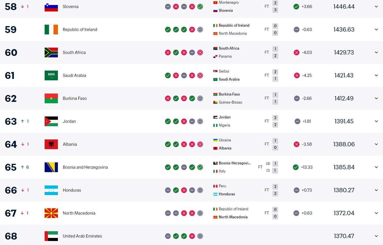 Në krahun tjetër, Kosova vijon të tregojë progres, duke u ngjitur në vendin e 78-të, pozicioni më i lartë në historinë e saj që nga pranimi në FIFA dhe UEFA (2016). Edhe pse u mposht në finalen e play-off-it nga Turqia, fitorja spektakolare 3-4 ndaj Sllovakisë në gjysmëfinale ka ndikuar ndjeshëm në këtë ngjitje.