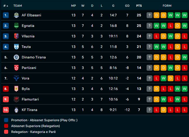 Pas ndeshjeve të sotme kreu ndahet nga AF Elbasani dhe Egnatia, ndërsa në fundin e "ftohtë" mbeten Bylis, Flamurtari dhe Tirana.