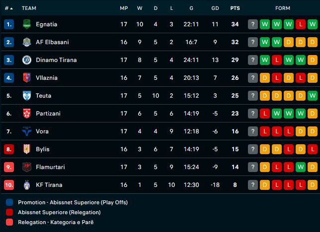 Me dy ndeshje ende për t'u zhvilluar, për momentin është Egnatia që prin renditjen me 34 pikë, dy më shumë se AF Elbasani. Fundi sërish për Bylisin, Flamurtarin dhe Tiranën.
