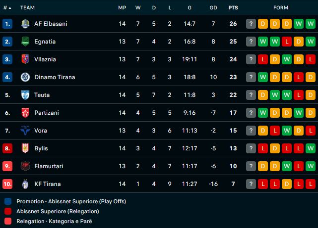Kur duhen ende dy takime nga fundi i raundit të 14-të, është AF Elbasani me 26 pikë që mban kreun. Nga ana tjetër Egnatia dhe Vllaznia kanë shansin që të dalin në krye pas ndeshjeve të sotme.