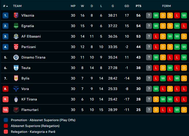 Superliga shqiptare e futbollit mbylli këtë të diel raundin e 30-të me fitoren e Vorës 1-0 kundër Teutës. Një gol i Irgi Kasallës në minutën e 32-të i mjaftoi vorakëve të Arjan Bellait për të marrë tri pikë me shumë peshë dhe për të mebetur në vendin e tetë të renditjes, duke lënë pas KF Tiranën dhe Flamurtarin.
