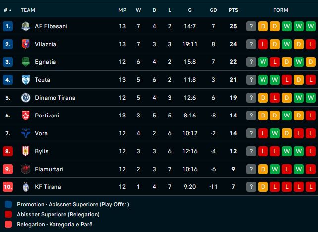 Superliga shqiptare e futbollit nisi të premte me raundin e 13-të. Dje u zhvilluan dy sfida, ndërsa tre të tjerat janë në program për sot. Tri pikë për Teutën në Shkodër, teksa AF Elbasani dhe Partizani e mbyllën sfidën mes tyre në barazim pa gola.