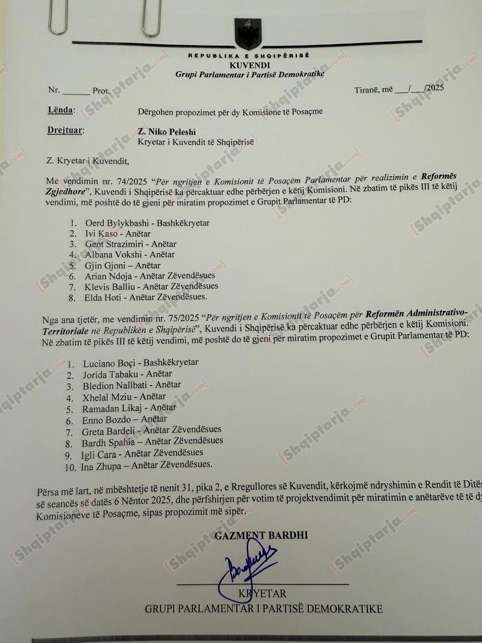 Gazetarja e Report TV, Daniela Maloku ka zbardhur emrat e anëtarëve të PD-së për të dy Komisionet e Posaçme për Reformën Zgjedhore dhe atë Territoriale. Grupi Parlamentar i PD-së i ka dërguar edhe një shkresë Kuvendit, ku kërkon futjen në rendit të ditës edhe miratimin e anëtarëve të dy komisioneve.