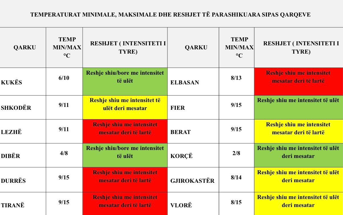 “Bazuar në informacionin e Shërbimit Meteorologjik Ushtarak për periudhën 06.02.2026 – 10.02.2026, parashikohen reshje shiu me intensitet të lartë në territorin e Qarkut Durrës, të cilat mund të shkaktojnë vështirësi dhe problematika.