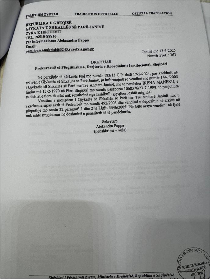 “Njoftimi për gjykimin e çështjes është publikuar në një fshat afër kufirit, vend me të cilin nuk kam asnjë lidhje. Konkretisht, nga përmbajtja e vendimit nr.1447/2005, datë 07.06.2025, rezulton se fletëthirrja nr.408/2004, e lëshuar nga prokurori i Gjykatës së Shkallës së Parë Janinë, i është dorëzuar sipas ligjit dhe brenda afatit, Kryetarit të Bashkisë Delvinaki, Janinë, nga punonjësi i policisë së Rajonit të Policisë Kakavijë, Janinë, sepse vendbanimi i të pandehurit është i panjohur. Kjo fletëthirrje është shpallur nga nëpunësi i Bashkisë në stendën e afishimeve publike. Për sa më sipër, ritheksoj se nuk kam marrë asnjëherë njoftim faktik dhe ligjor mbi procesin e zhvilluar ndaj meje në shtetin grek, për sa kohë mënyra e përzgjedhur e njoftimit, ajo e shpalljes publike pranë Bashkisë Delvinaki Janinë, nuk ka garantuar të drejtën time thelbësore për të marrë dijeni lidhur me këtë proces”,- thotë Gjoka.