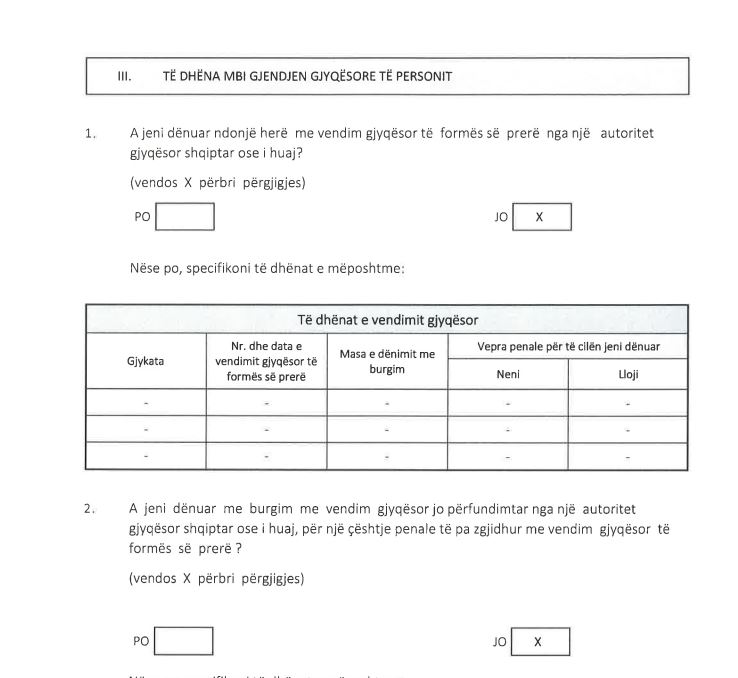 Për këto arsye, ajo thotë se nuk mund t’u përgjigjej veçse me “JO” pyetjeve në formularin e dekriminalizimit që lidhen me dënime apo vendime dënimesh.
