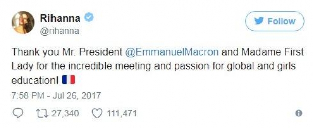 Lidhur me këtë nismë të saj, dje Rihanna takoi presidentin francez Emmanuel Macron dhe bashkëshorten e tij, Brigitte Trogneux.