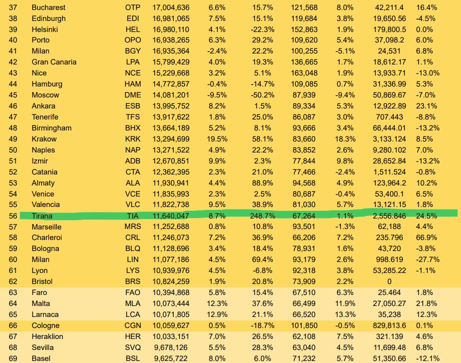 Gjithashtu, sa i përket renditjes rajonale të aeroporteve të Ballkanit Perëndimor, Tirana International Airport (TIA) konfirmohet si aeroporti më i madh dhe me volumin më të lartë të pasagjerëve, me 11,640,047 udhëtarë me një rritje vjetore prej 8.7%. Me këtë performancë, Tirana qëndron dukshëm përpara Beogradit (BEG), i cili ka regjistruar 8,913,520 pasagjerë, me një rritje më të moderuar prej 6.5%.