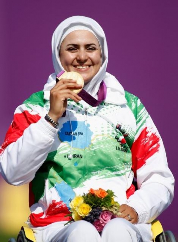 Zahra Nemati 31 vjeç nga Irani do të parakalojë e mbuluar dhe duke ecur me karrigen me rrota pasi është dëmtuar gjatë një tërmeti.