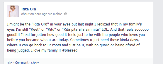 Këngëtarja me origjinë kosovare Rita Ora ka postuar në faqen e saj zyrtare në Facebook disa statuse në të  cilat shprehej mjaft entuziaste për origjinën e saj.