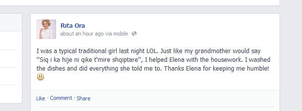 Këngëtarja me origjinë kosovare Rita Ora ka postuar në faqen e saj zyrtare në Facebook disa statuse në të cilat shprehej mjaft entuziaste për origjinën e saj.