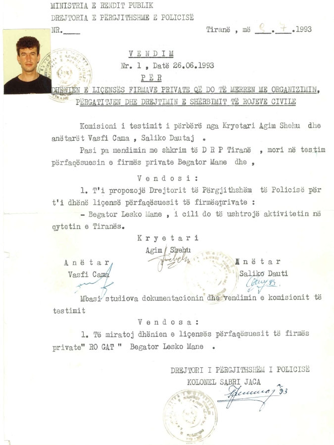 Në këto kushte ai themeloi Kompaninë e parë shqiptare me emër “RO.GAT SECURITY” për mbrojtjen dhe sigurinë fizike, e njohur si person juridik me Vendimin Gjyqësor Nr.4650-100, datë 26.05.1993 dhe paisur me Liçensë të ushtrimit të profesionit me Nr.1, datë 26.06.1993 e lëshuar nga Ministria e Rendit Publik. Pas ndryshimit të ligjit përkatës, kompania ne vitin 2001, u pajis me Liçensë të ushtrimit të aktivitetit në kategorinë “A+B”, me objekt ruajtjen dhe sigurinë fizike të objekteve publike dhe private si dhe mbrojtjen e jetës dhe shëndetit të qytetarëve vendas dhe të huaj në teritorin e Republikës së Shqipërisë.