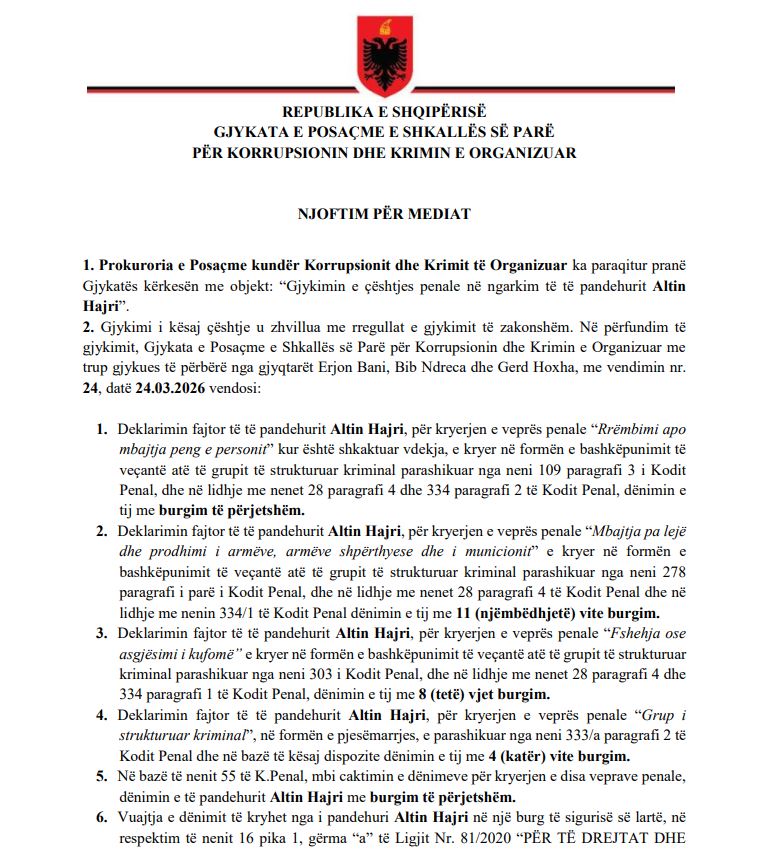 Gjykata e Posaçme vendosi të dënojë me burgim të përjetshëm në mungesë pronarin e kompleksit “Golden” në Shijak Altin Hajri për rrëmbimin dhe zhdukjen e Jan Prengës në janar të vitit 2020. Pavarësisht pretendimeve të mbrojtjes për pafajësi, GJKKO e ka gjetur fajtor dhe ka pranuar kërkesën e prokurorëve Elida Kaçkini dhe Behar Dibra për të vendosur dënimin më maksimal që parashikon ligji.